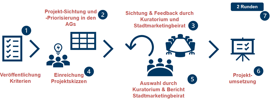 Das Kuratorium trifft daraufhin eine Auswahl. Bei positivem Bescheid können die Projekte in die Umsetzung gehen. Der Stadtmarketingrat wird laufend durch das Projektbüro informiert.