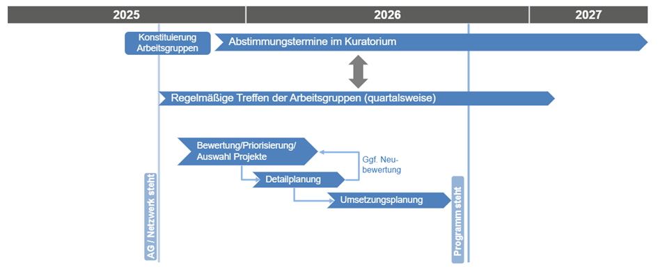 An dieser Stelle erhalten Sie einen Überblick, wie Arbeitsgruppen (AGs), Kuratorium, Politik und Projektbüro die nächsten Planungsschritte für das Jubiläumsjahr gemeinsam abstimmen.