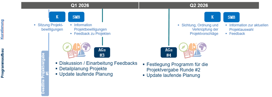 Die ersten Ideen werden von den AG-Sprecher:innen dem Kuratorium vorgestellt. Dieses gibt Rückmeldung, die von den Sprecher:innen in die Arbeitsgruppen zurückgetragen werden. Anschließend entwickeln die Arbeitsgruppen die Projektskizzen weiter und reichen sie dann offiziell beim Projektbüro ein. Das Projektbüro prüft die Projektskizzen technisch anhand der Bewertungskriterien und gibt die Projektskizzen an das Kuratorium weiter. Die Bewertungskriterien werden zeitnah veröffentlicht.